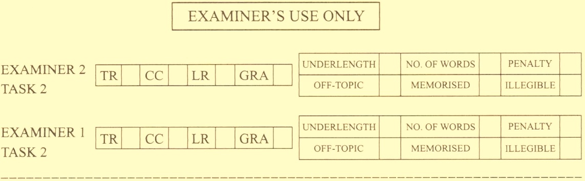 - Giám khảo chấm bài theo bốn tiêu chí: Task Response, Coherence and Cohesion, Lexical Resource và Grammatical Range and Accuracy.