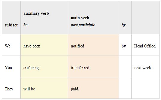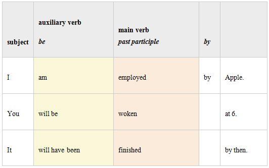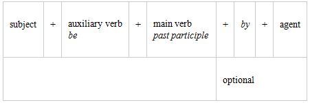 The basic structure of a passive clause is very simple:The auxiliary be is conjugated in all tenses. The main verb is always the past participle. The agent is the original "doer" of the action.