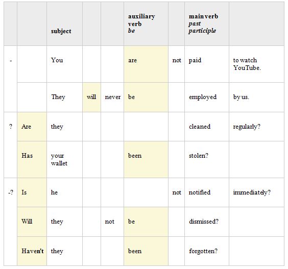 The table below shows examples of the passive with negative sentences, question sentences and negative-question sentences: