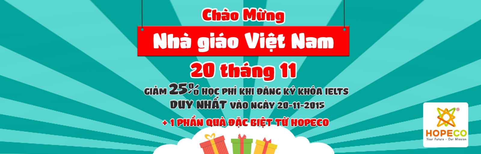 Ngày nhà giáo Việt Nam là ngày lễ tôn vinh những người thầy, người cô nhằm vào ngày 20/11 hằng năm ở Việt Nam. Nhân dịp này, HOPECO đưa ra chương trình ưu đãi hấp dẫn cho các học viên khi đăng kí học IELTS tại trung tâm. Chương trình áp dụng dành cho học viên mới và cũ.